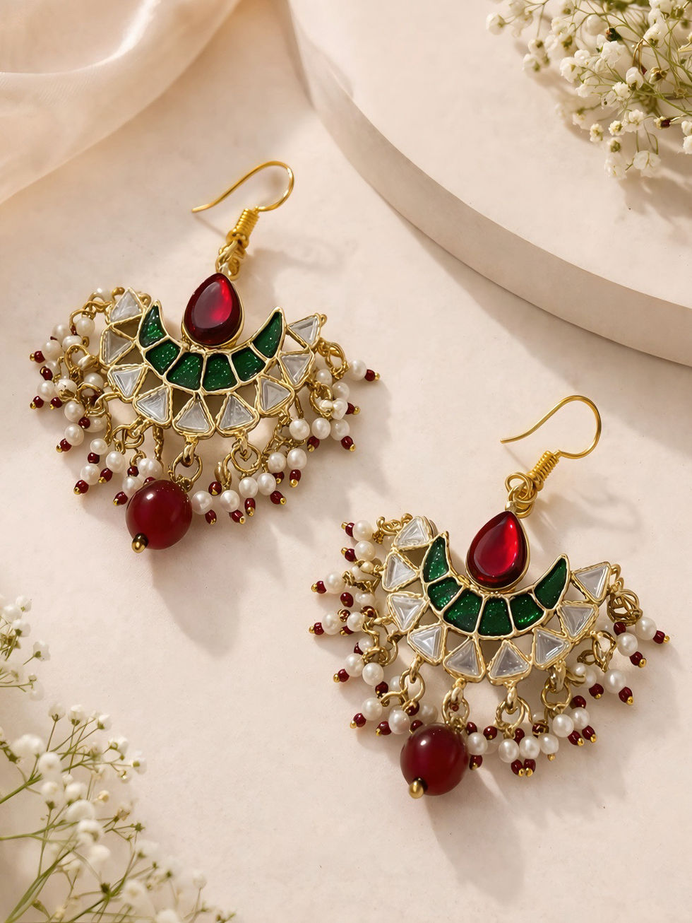 Make a lasting impression with the Vyavi Ragaara Kundan Pearl Necklace Set, crafted in premium German alloy with rich gold-layered plating and finely detailed stonework.