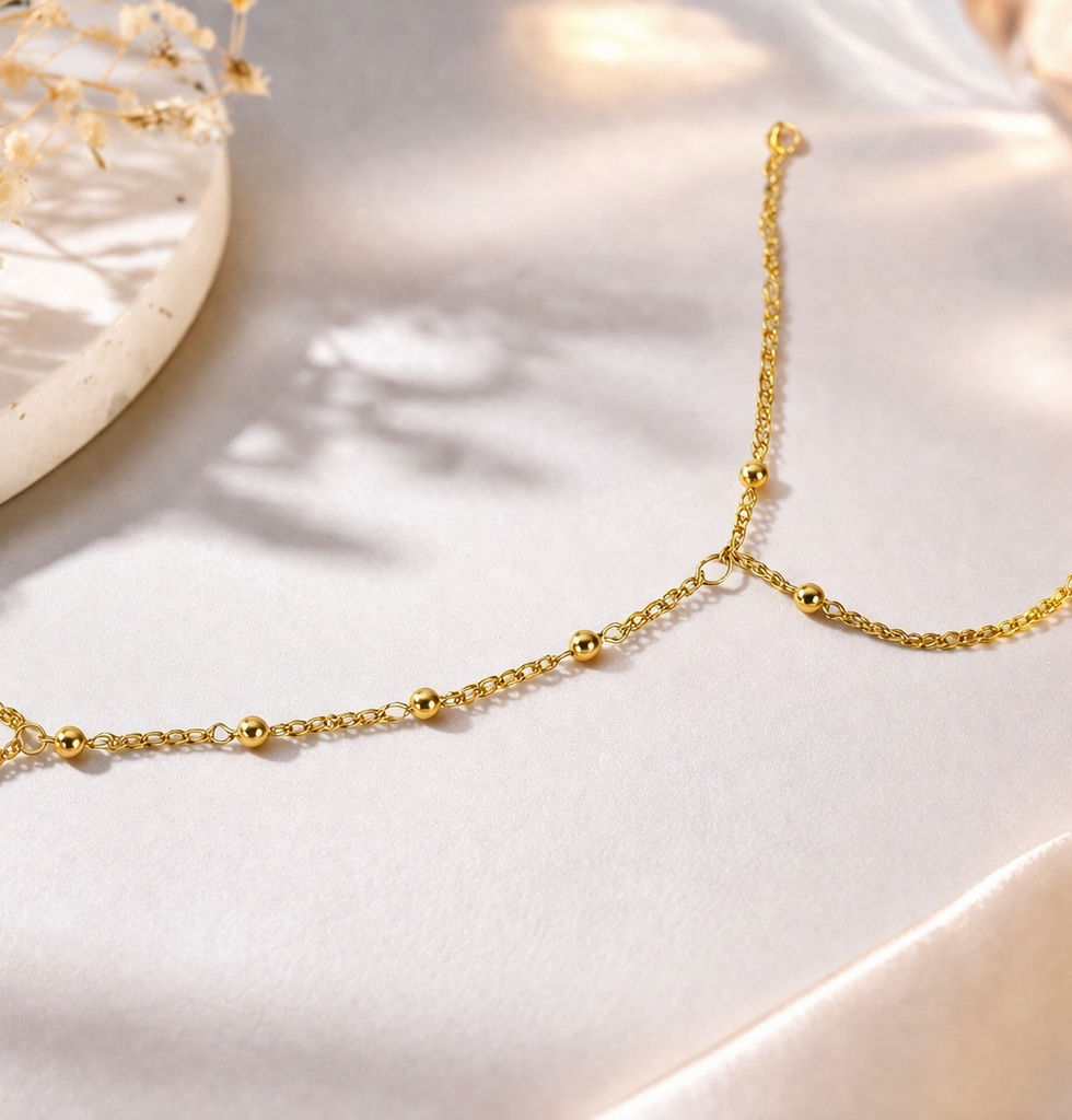 Designed with a delicate chain structure and evenly spaced gold bead accents, this piece brings a modern, minimal elegance to traditional hand jewellery.